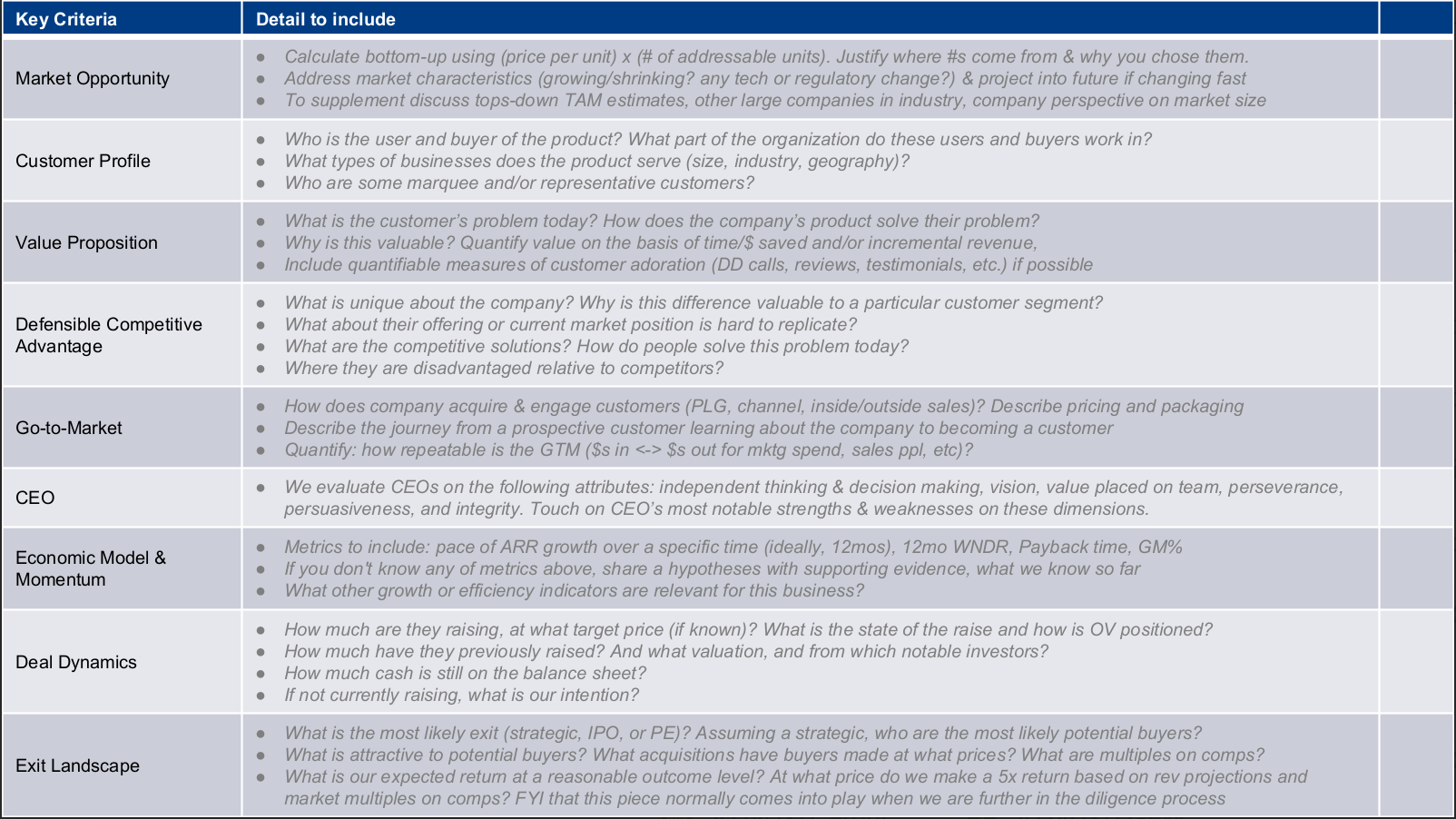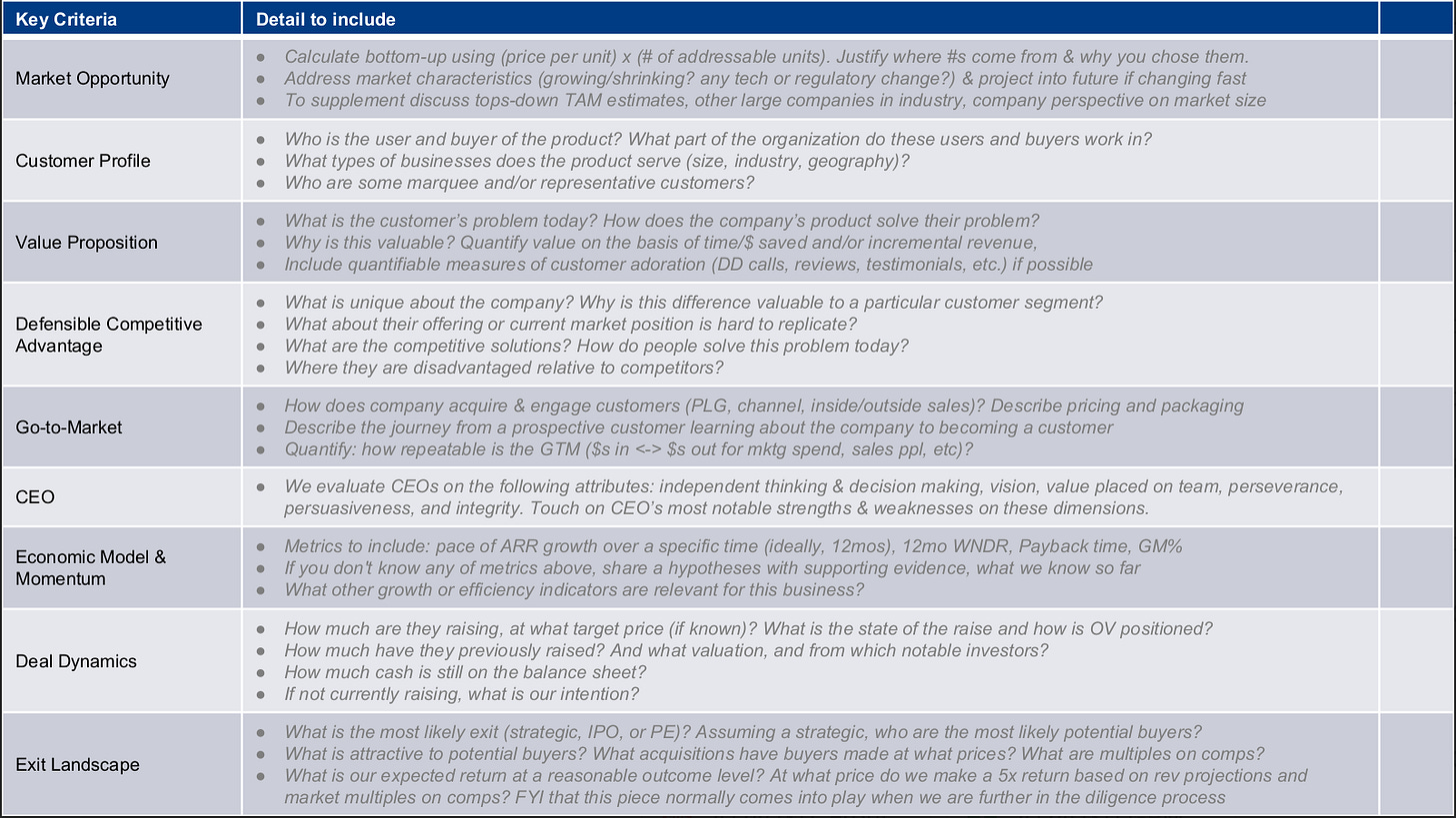 I first learned how to do venture at OpenView (RIP). The training was phenomenal and also incredibly painful. We would have to write these long, exhaustive investment memos for investments we were never actually going to do - it took hours, multiple drafts, and honestly quite a few tears were shed. At the beginning of each of these memos was a concise one-pager that broke down all of the work you did into a single sheet of paper for the IC to grok the opportunity. No fluff- just a structured breakdown of the business. I went through my archives and found it. Now granted, OV was later stage and this is very much of its time (circa I think ~2018), but the framework still holds up surprisingly well…